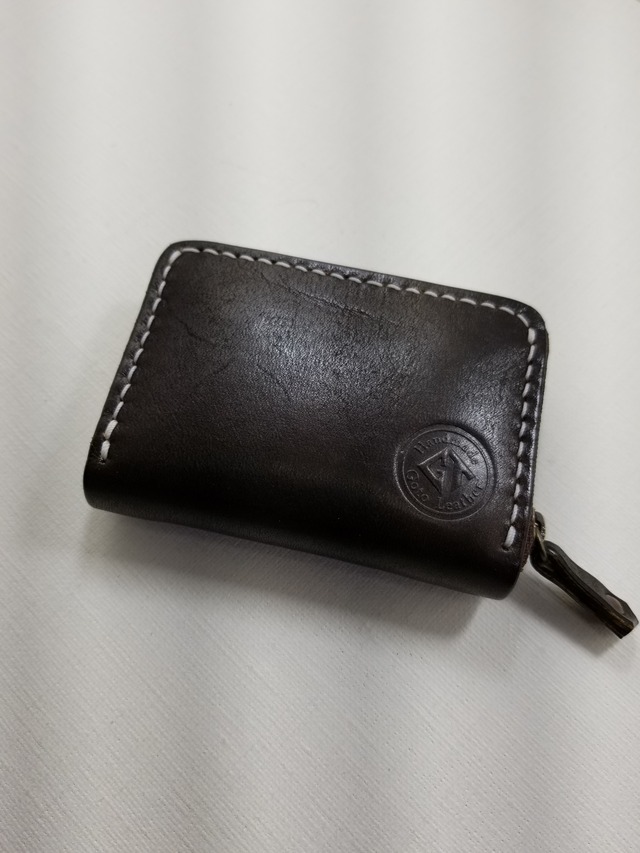 外装は手染め、カード12枚収納、レシートポケットが左右とコインケース部横に1つの計3ヶ所あり。(制作時に少し汚してしまいましたのでお安く提供しています。)
